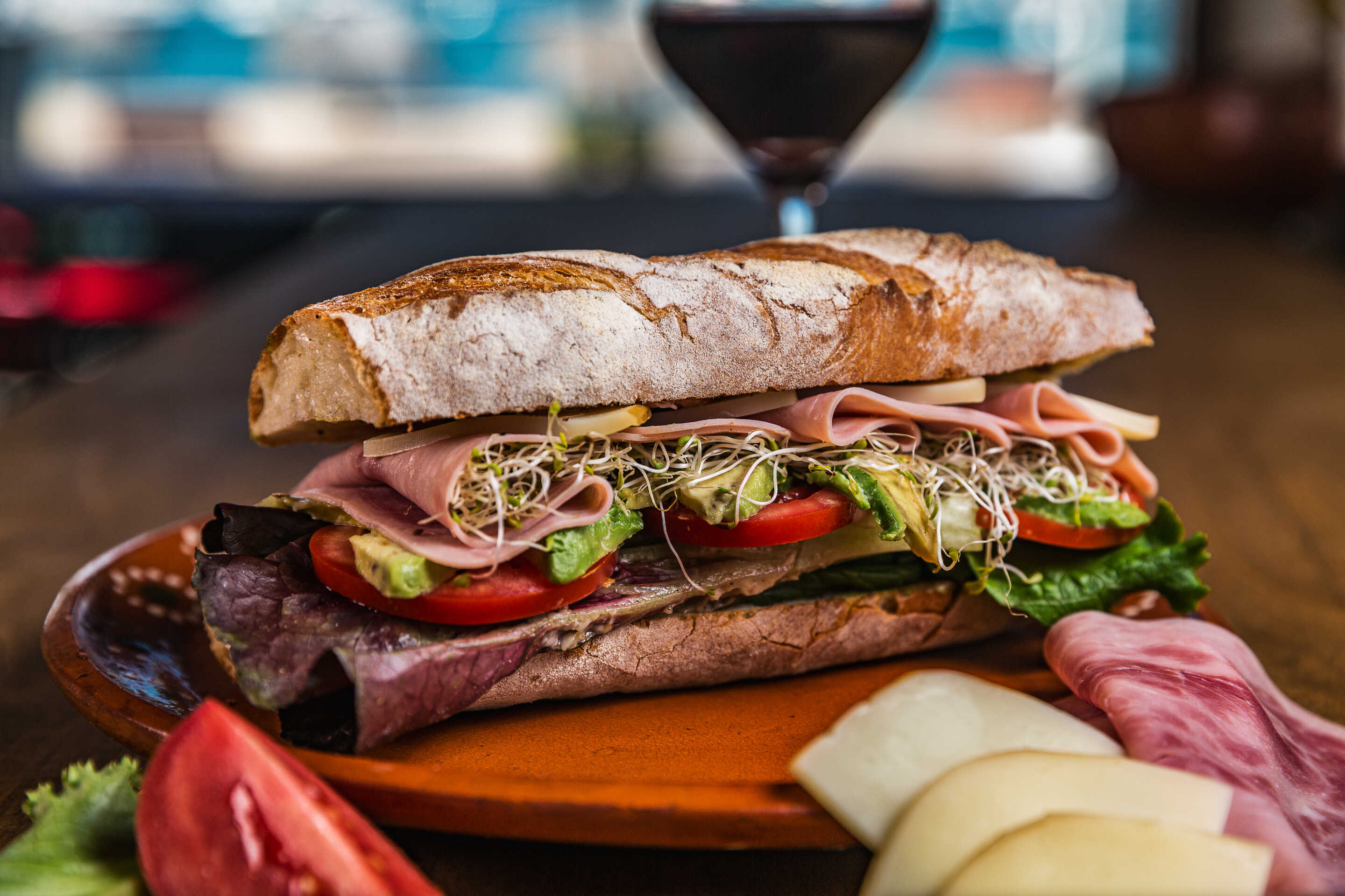 Jamón de pierna, queso provolone ahumado sobre una cama de lechugas, jitomate y aguacate.