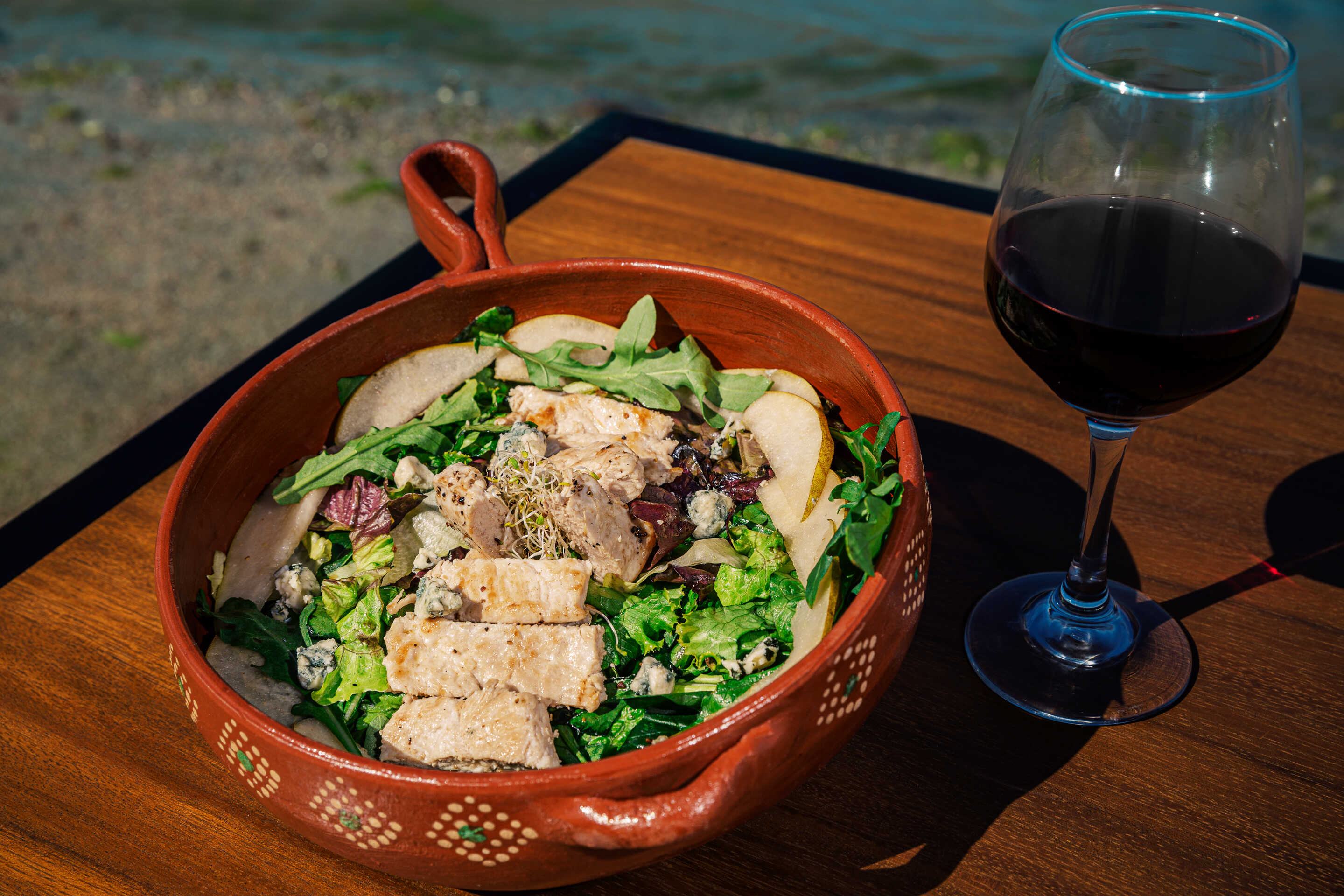 Lechugas, espinacas, pollo a la parrilla, pera, queso azul, bañada con aderezo balsamico.