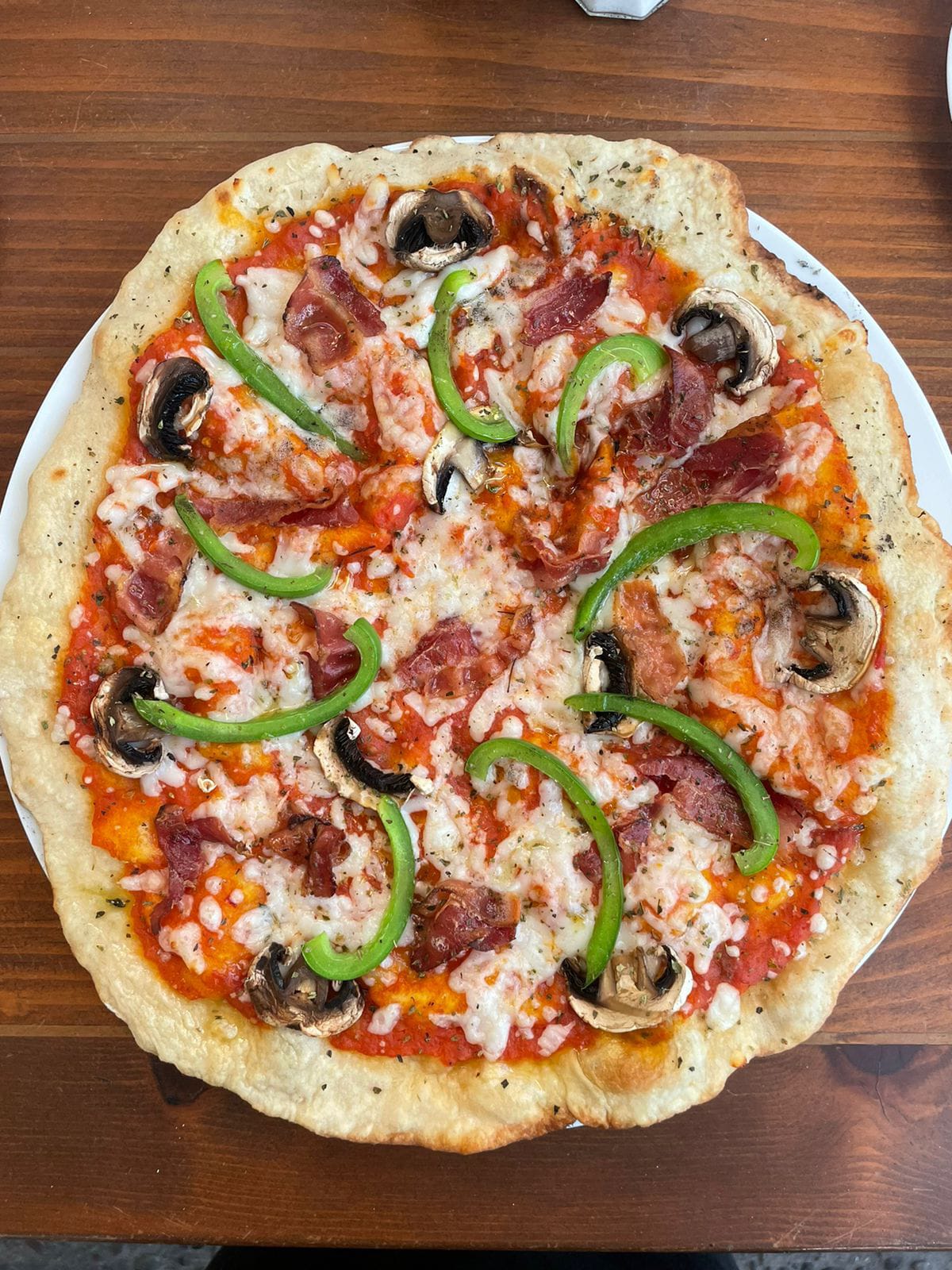 Tocino ahumado de la casa, champiñones orgánicos y pimientos rojos asados al fuego.