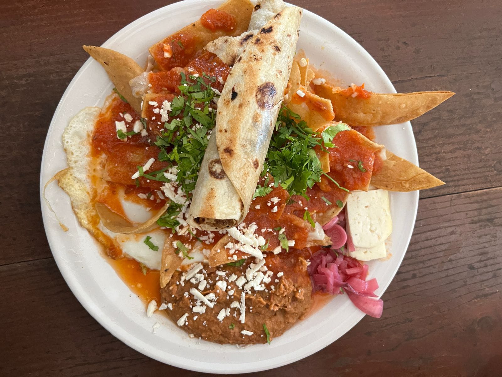 Dos huevos estrellados, chilaquiles rojos o verdes, un burrito de machaca, frijoles refritos, queso fresco del centenario y cebolla morada encurtida.