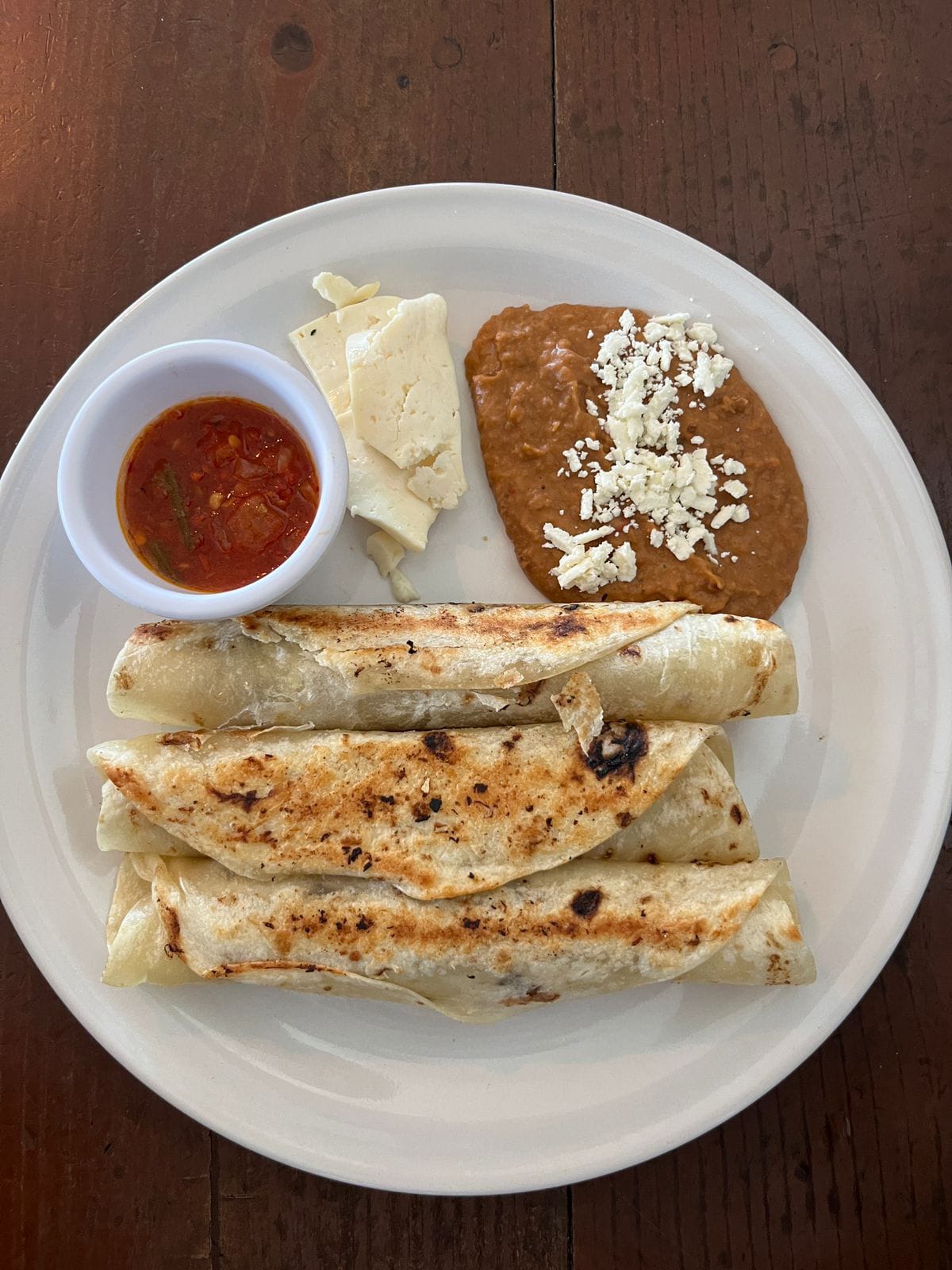 Tres burritos de machaca de res, frijoles refritos, queso fresco y salsa martajada.