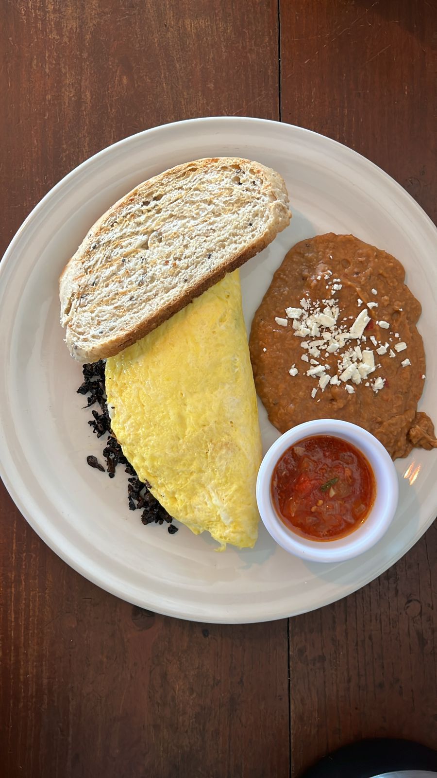 Dos huevos estrellados, jamón de pavo, tortilla de maíz, salsa ranchera y frijoles refritos.