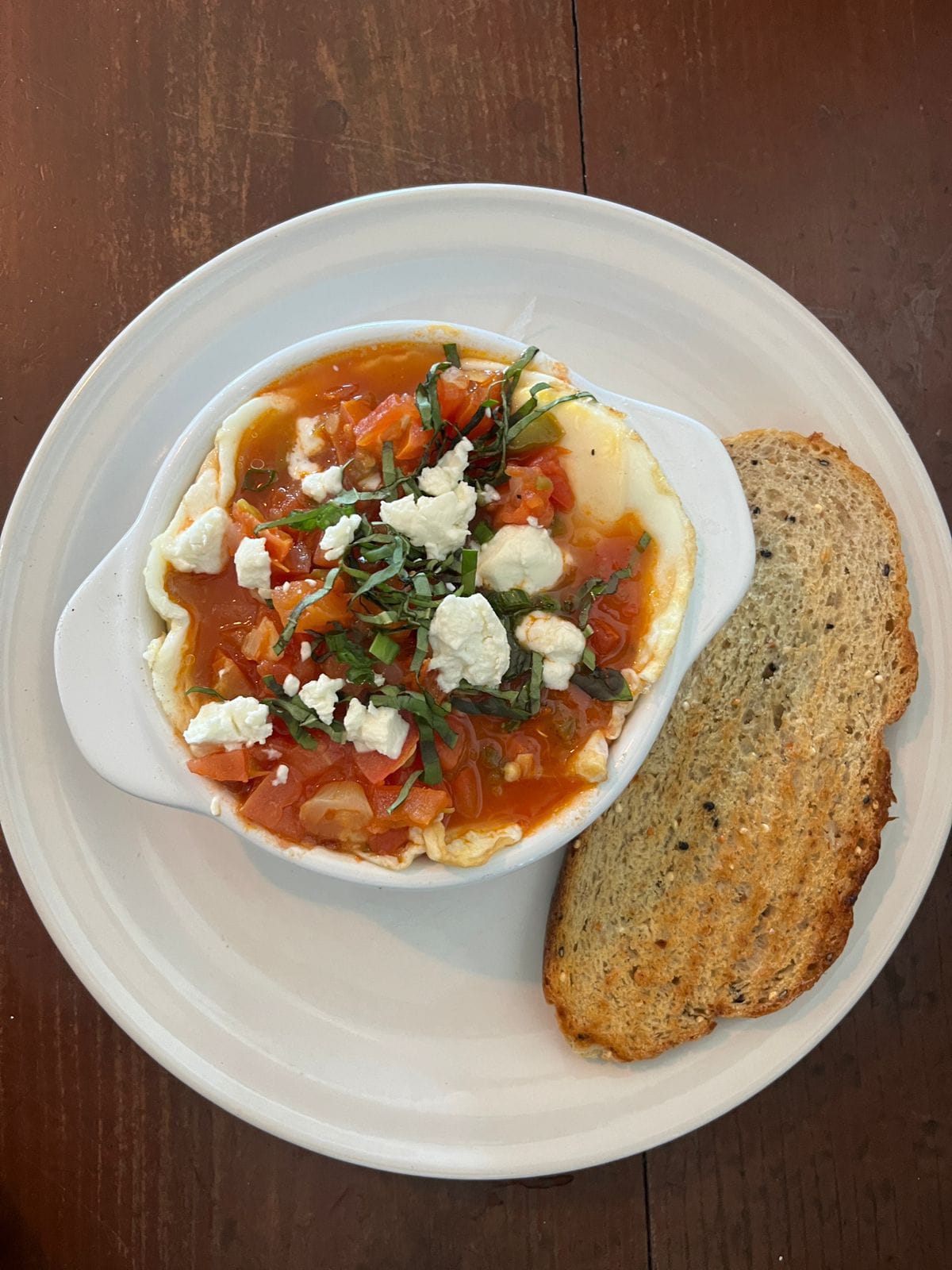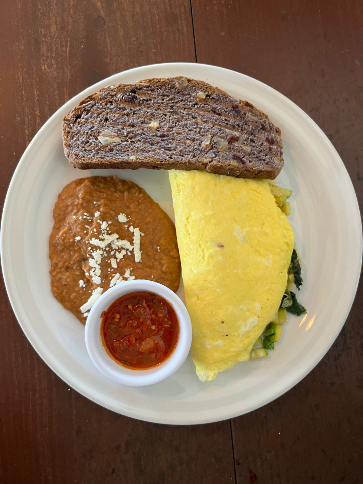 Dos huevos con salteado de calabaza, pimiento verde, albahaca fresca, queso de cabra, tomate, cebolla caramelizada, jamón de pavo y cebollín.