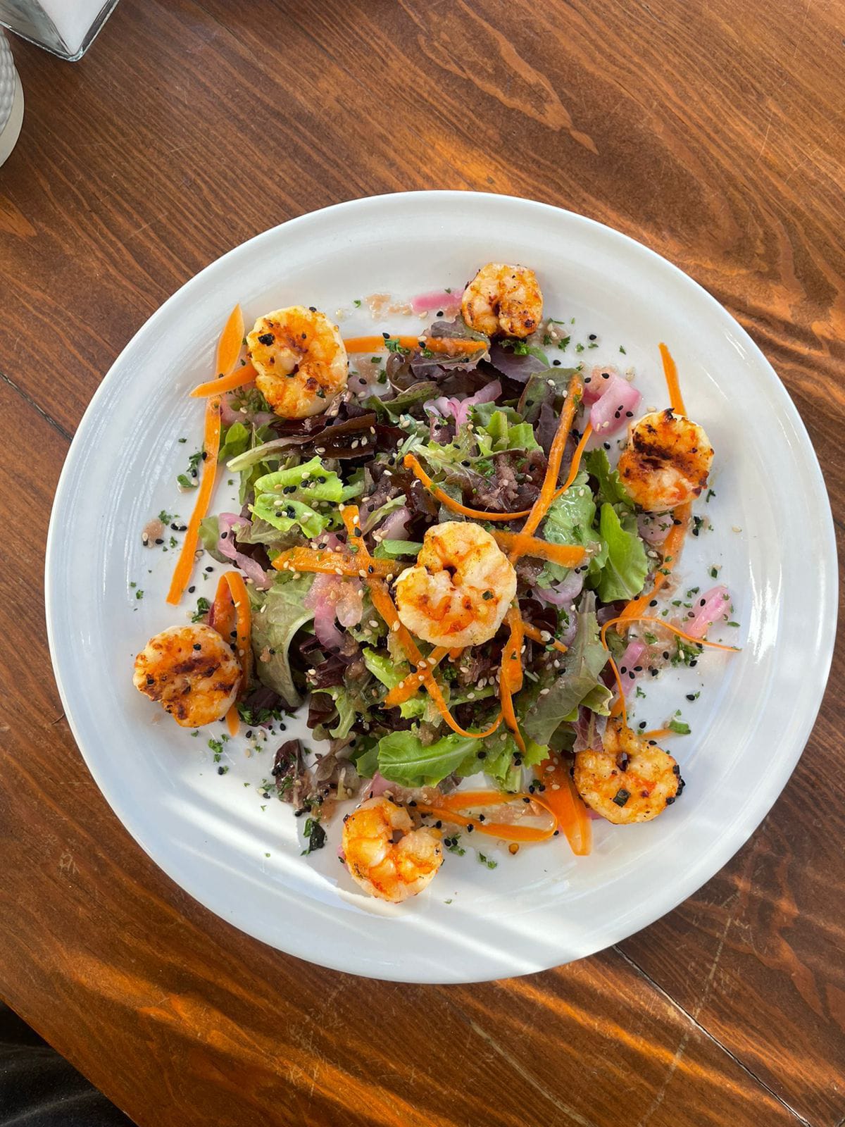 Camarones del pacifico ahumado en casa, zanahoria en rodajas, cebollín, semillas de sésamo, cebollas orgánicas encurtida, servido con crema de wasabi sobre una cama de lechugas orgánicas con nuestra vinagreta de jengibre y tamari.