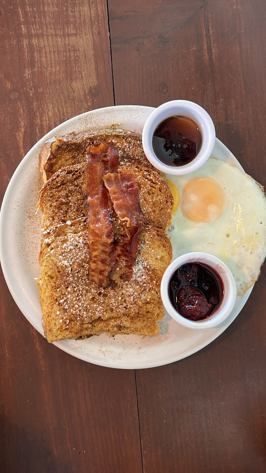Dos huevos estrellados, 2 pan francés, 2 rebanadas de tocino (se sirve con mermelada de frambuesa y mantequilla pomada).