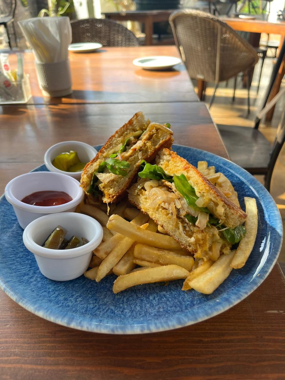Pechuga de pollo al grill, pesto de pimiento rojo, arugula, cebolla caramelizada, queso manchego en focaccia hecha en casa + guarnición