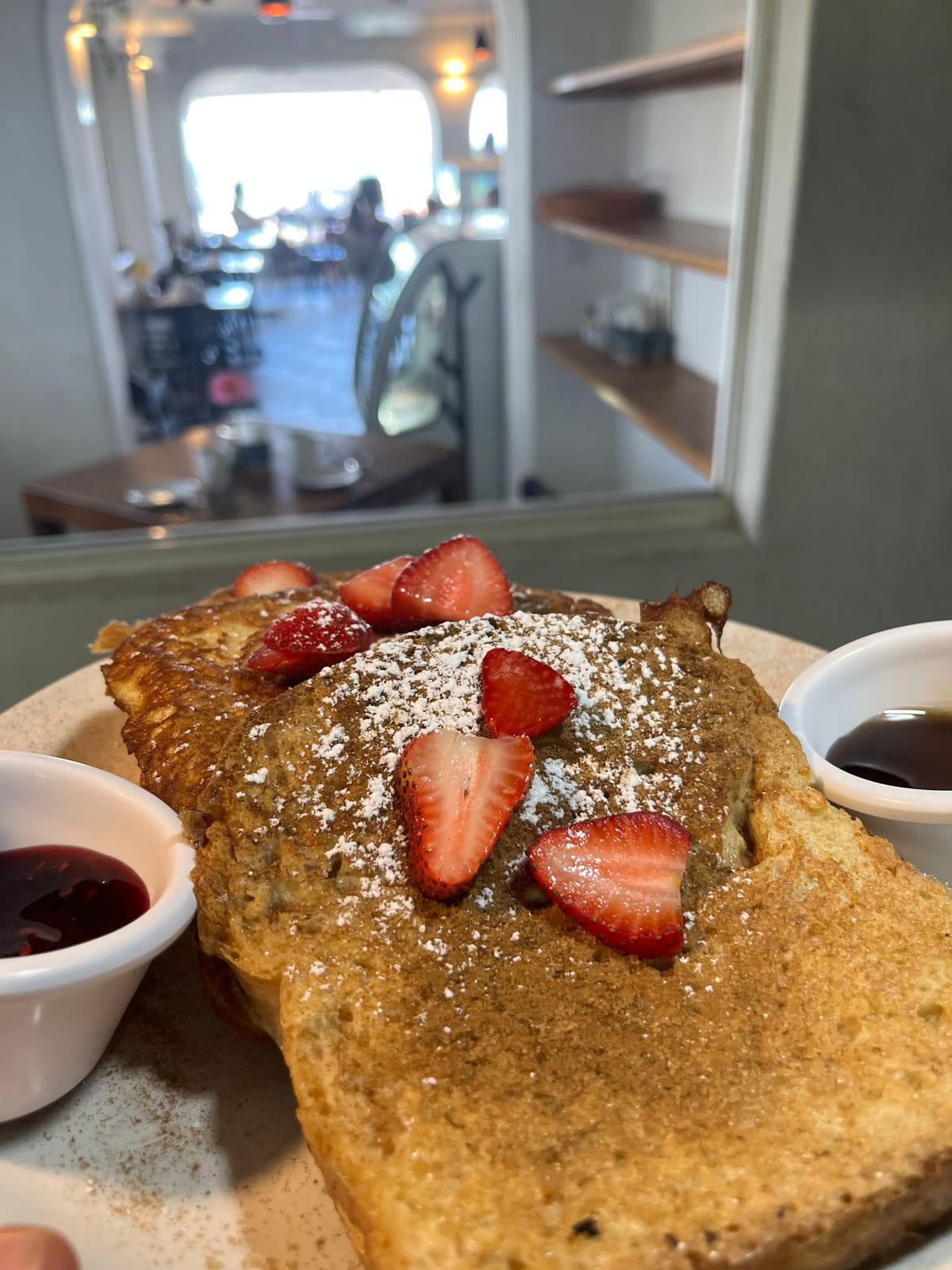 Tres rebanadas de pan hecho en casa, servido con miel maple y mermelada de frutos rojos.
