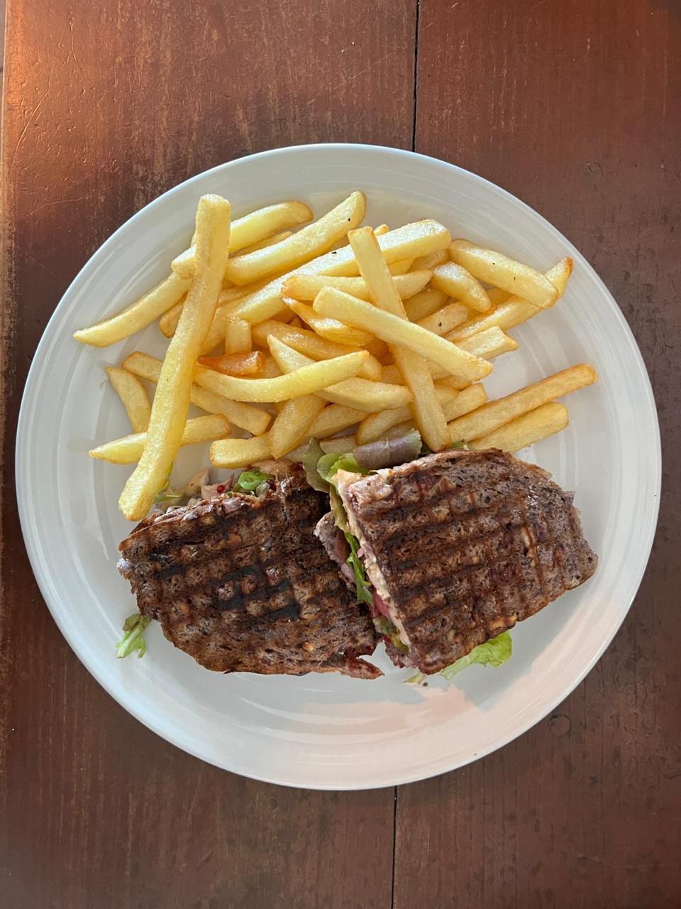 Arrachera, queso cheddar, queso gruyere, cebollas caramelizadas y salsa de la casa, sobre pan sourdough + guarnición