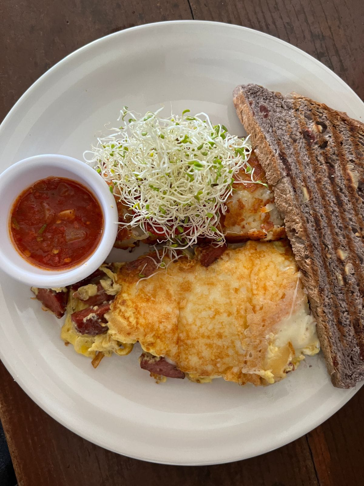 Dos huevos revueltos con chorizo español, cebolla caramelizada, tomate, queso monterrey, papas hash brown y pan tostado.