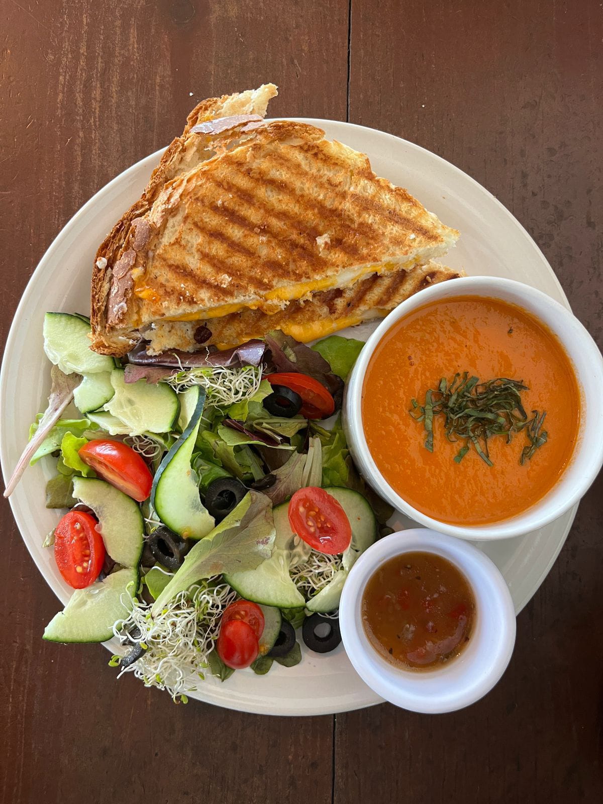 Queso cheddar derretido en pan blanco hecho en casa y sopa de tómate + guarnición