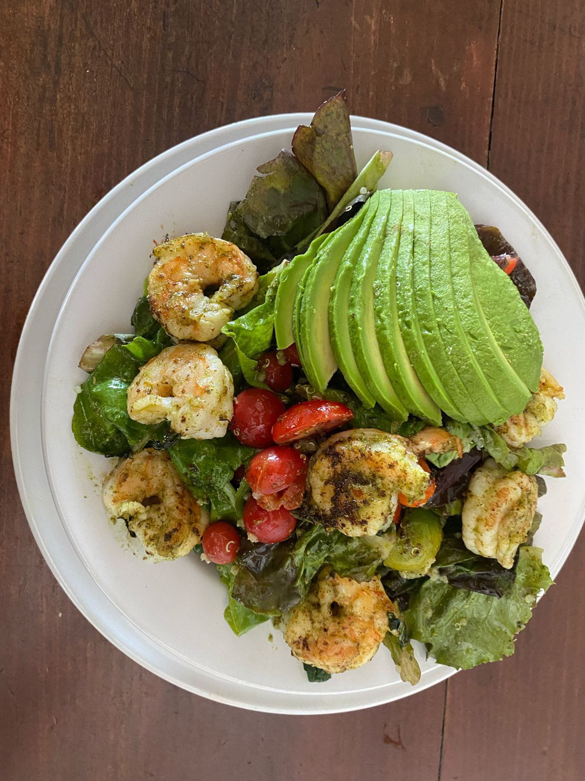 Lechugas mixtas con camarones salteados, aderezo de albahaca, tomates cherry, aguacate y quinoa.