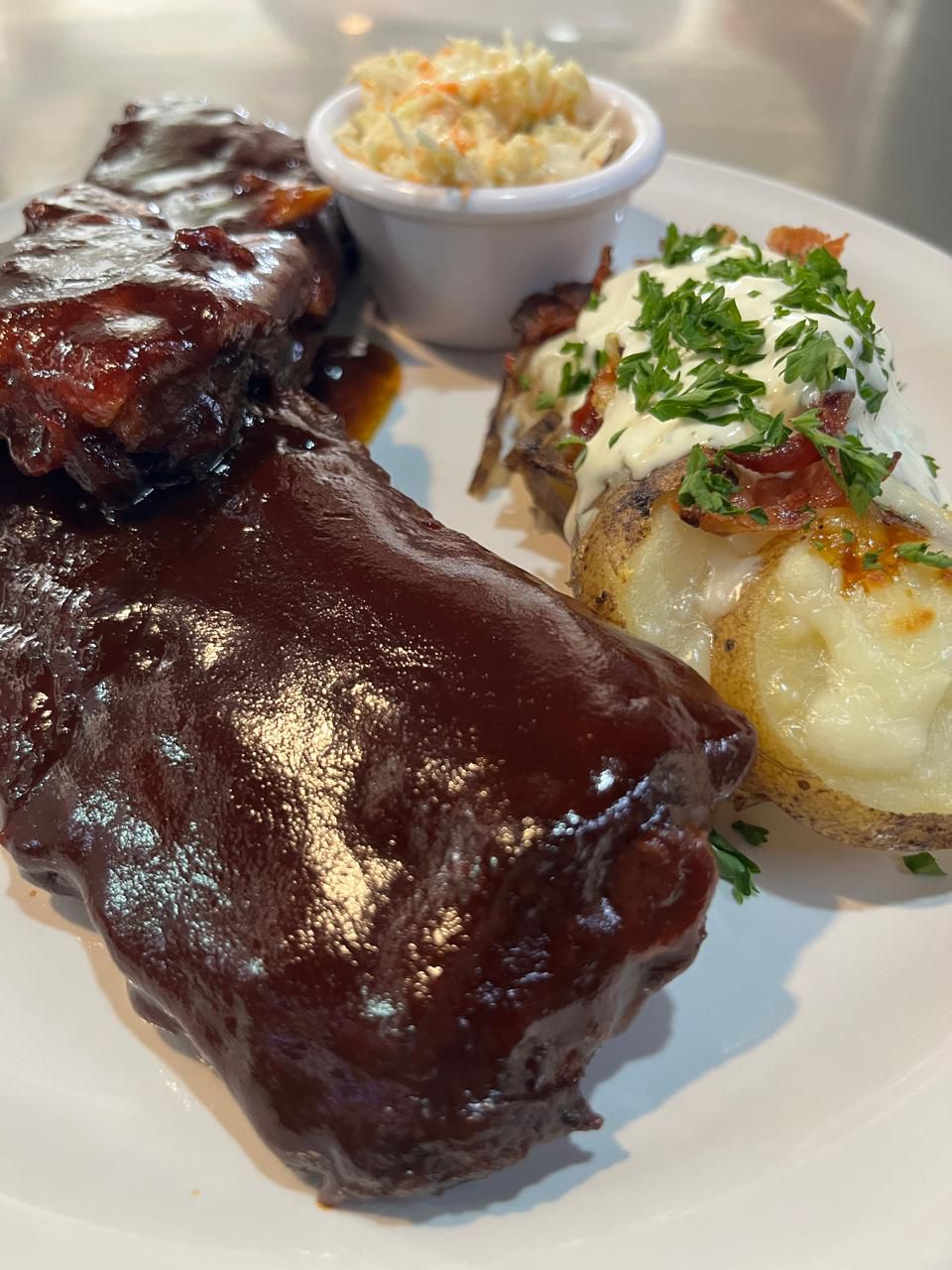 Cocinadas lentamente en Big Green Egg con papa al horno en mantequilla y ensalada de col.