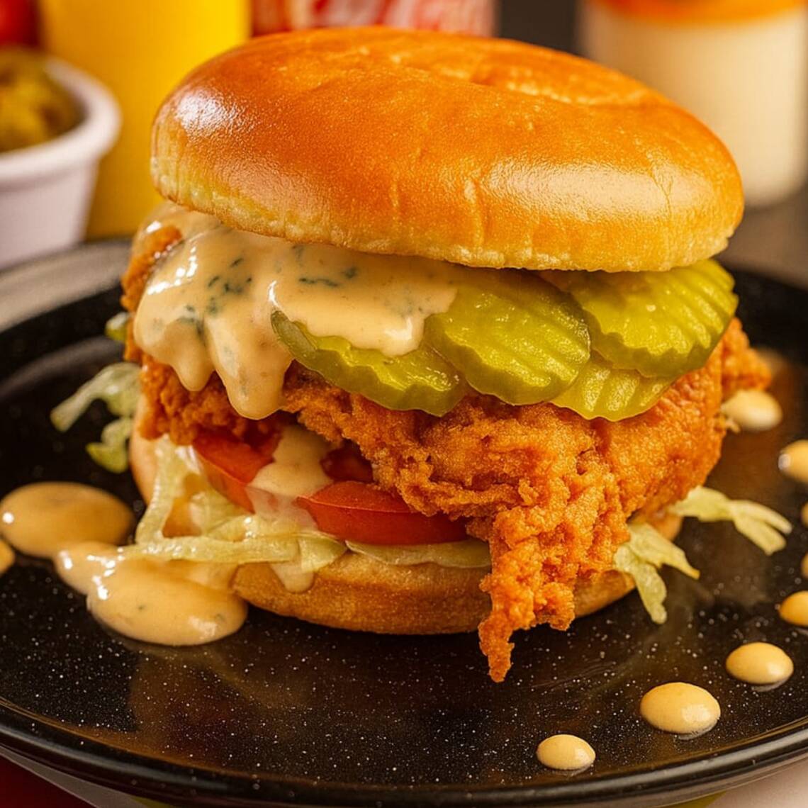 Suculenta pechuga de pollo empanizada bañada en BBQ Spicy, ensaladita dulce de col, adereo Ranch Casero y pepinillos. Acompañada de papas fritas.