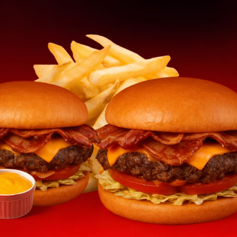 Perfecta combinación de aderezo rancho y salsa BBQ, aros de cebolla , queso cheddar, tocino y jugosa carne de res (.130 g), de base lechuga y tomate, acompañado de papas fritas