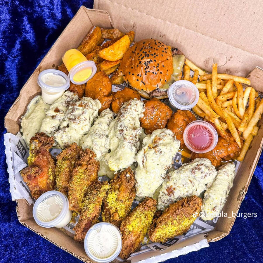 DELICIOSA HAMBURGUESA,12 ALITAS,300GRAMOS DE BONELES,ACOMPAÑADOS CON PAPAS Y DEDOS DE QUESO
