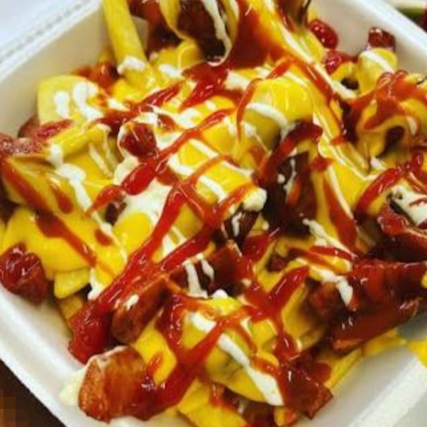 Carne de res, jamón, tocino, queso amarillo acompañado de papas.
