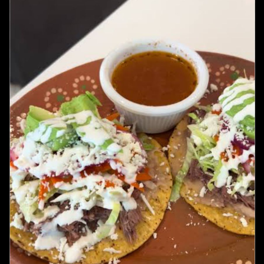 RICAS TOSTADAS DE CARNE DESEBRADA ,ACOMPAÑADAS CON LECHUGA,TOMATE,AGUACATE,QUESOY CREMA
