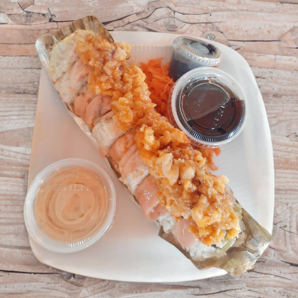 Adentro (zanahoria, pepino, aguacate y queso crema). Por fuera (salmón ahumado). Topping (camarón y sriracha) 360 g.