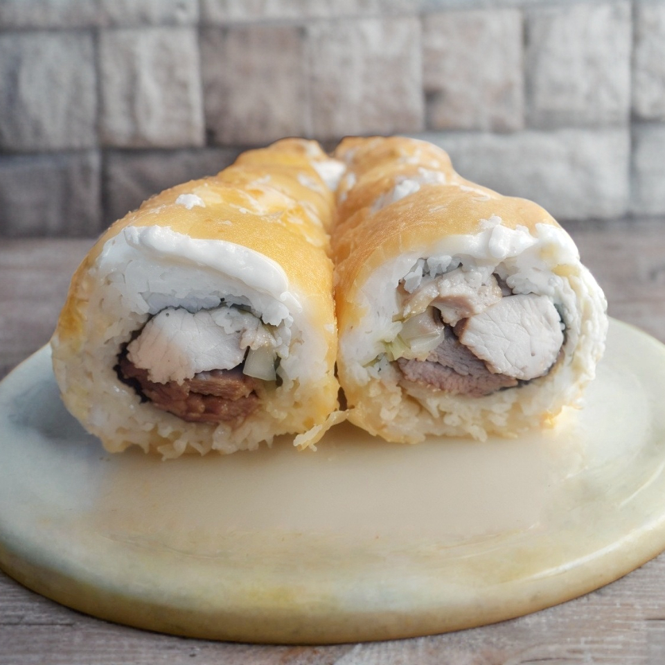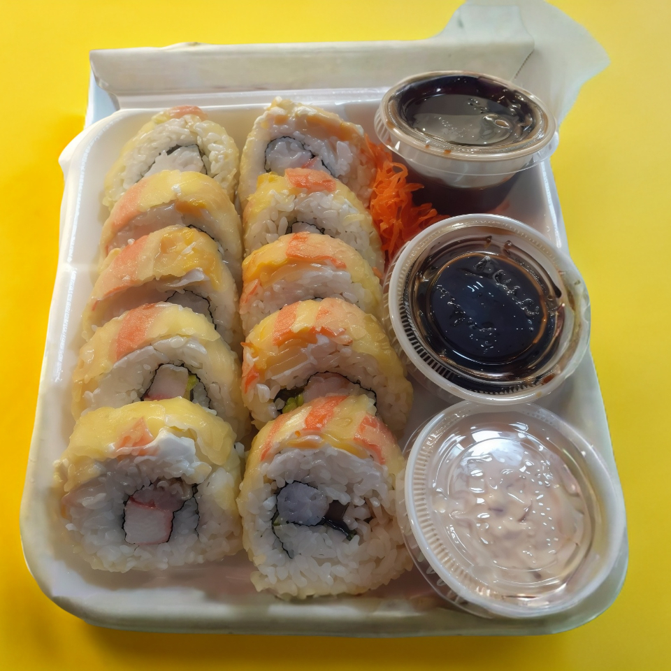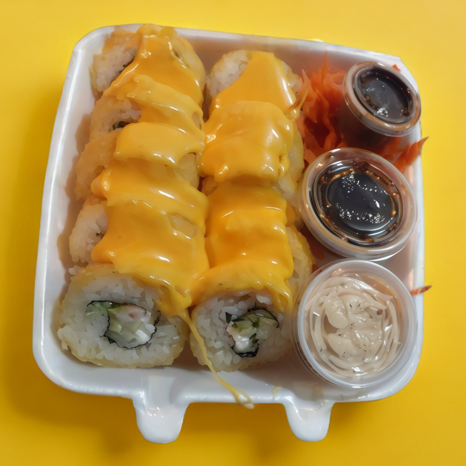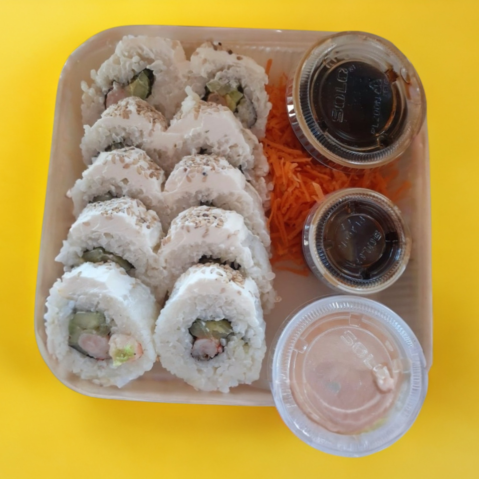 Adentro (camarón, pepino, aguacate, queso crema). Encima (topping de queso derretido). 360 g.