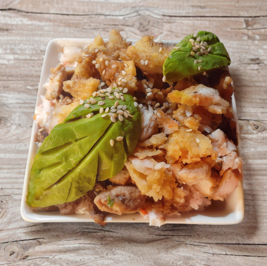 Platillo de arroz con queso crema, tampico, carne, pollo, camarón empanizado, aguacate salsa de anguila y ajonjolí. 355 g.