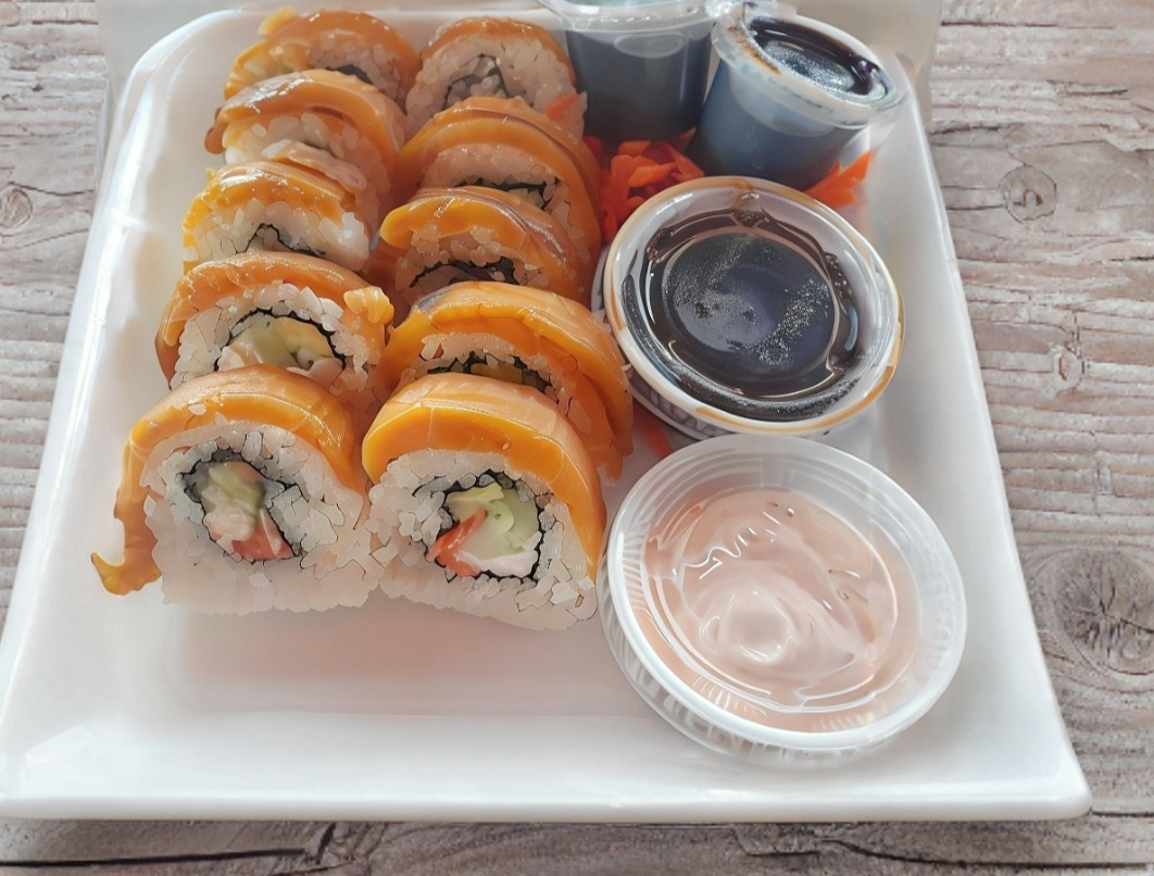 Adentro (salmón, pepino, aguacate, queso crema). Encima (chile quebrado). 350 g.