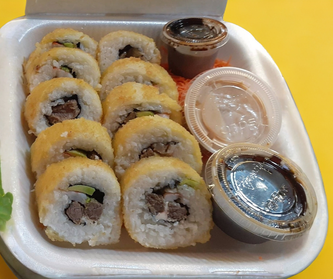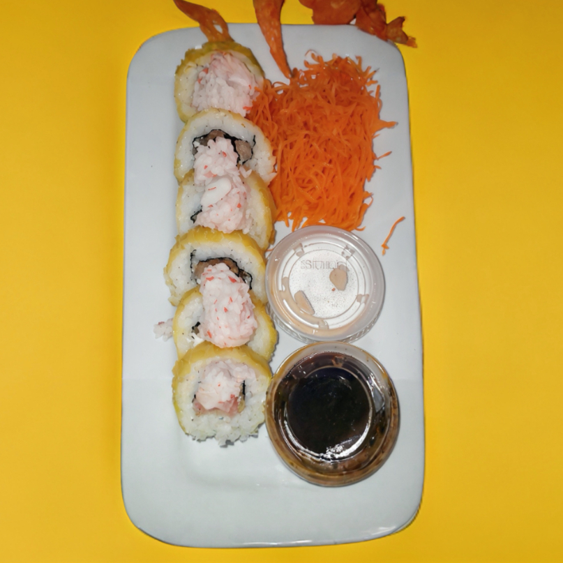 Rollo frito en tempura. Adentro (cangrejo empanizado, pepino, arroz frito, queso crema y aguacate). Encima (coco y aguacate) 360 g.