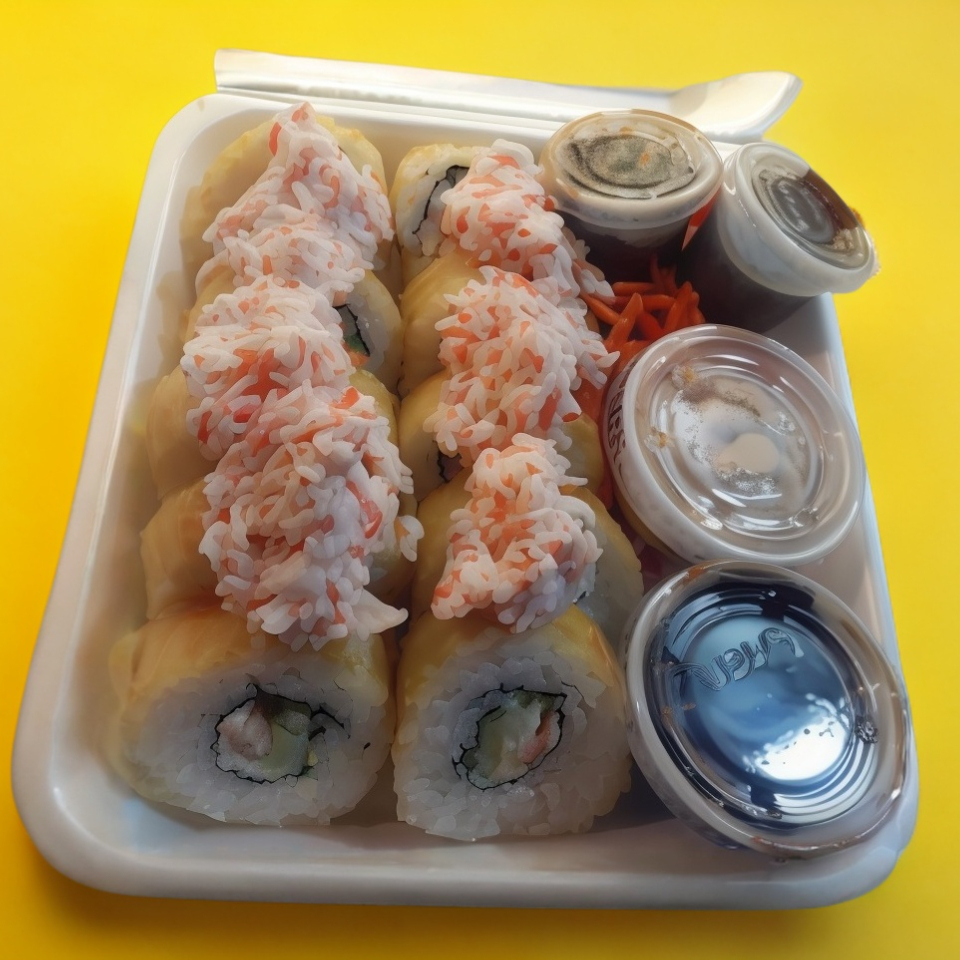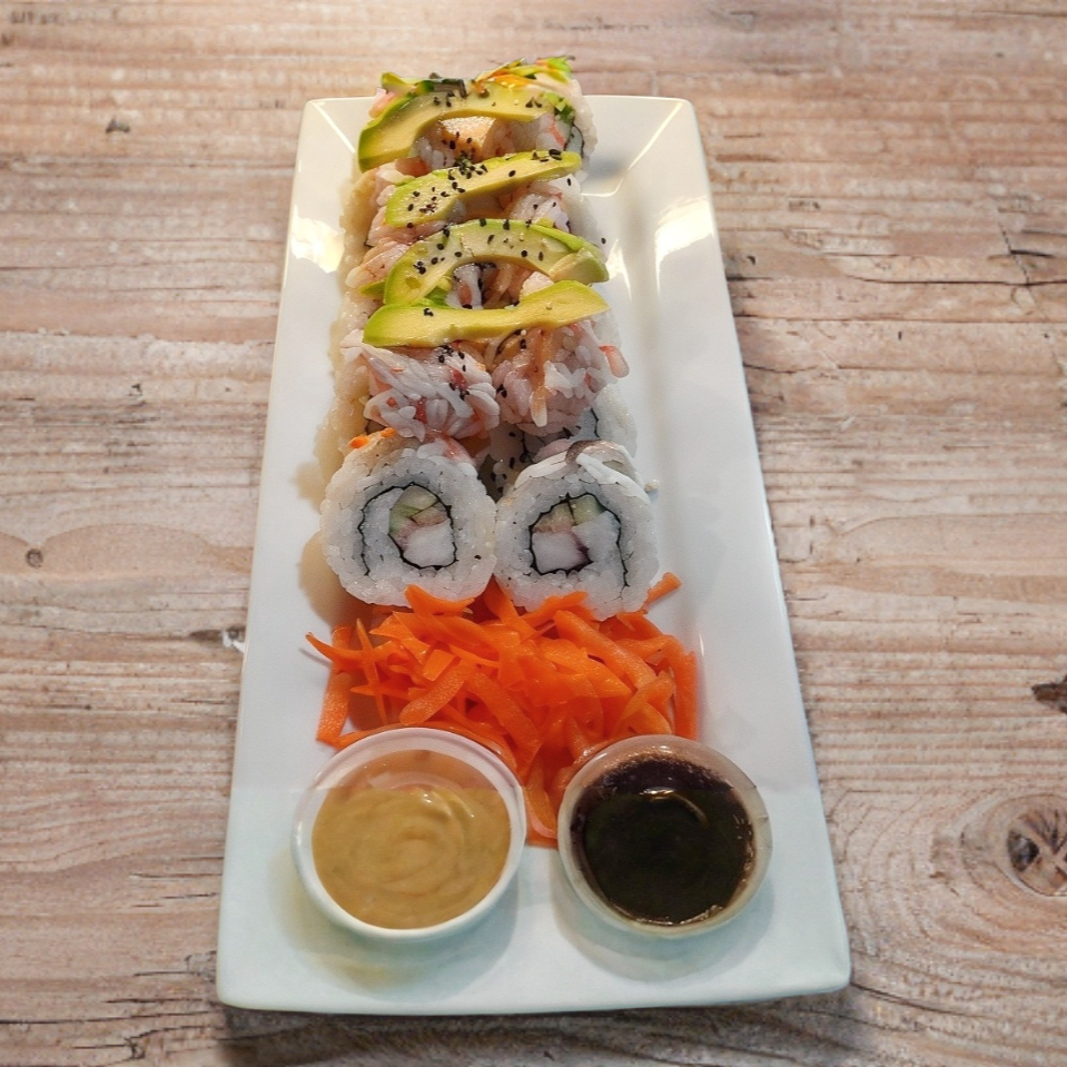 Adentro (res, pollo, zanahoria, pepino, aguacate). Encima (queso crema, camarón y aguacate). 350 g.