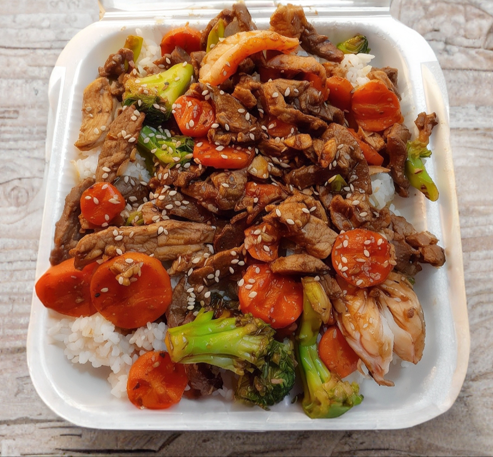 Arros blanco, res, camaron, pollo brocoli, coliflor, zanahoria nuez de la india salsa de ostion