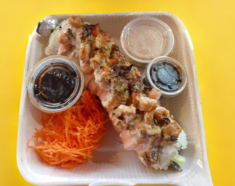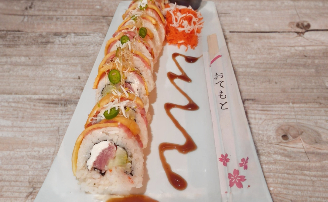 Adentro (res, queso crema, aguacate). Encima (tampico y salsa de anguila). 360 g.