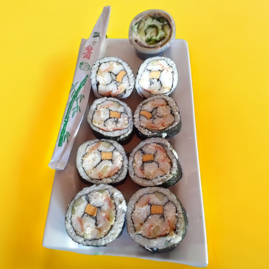 Adentro (camarón, pepino, aguacate). Encima (queso crema y ajonjolí). 340 g.