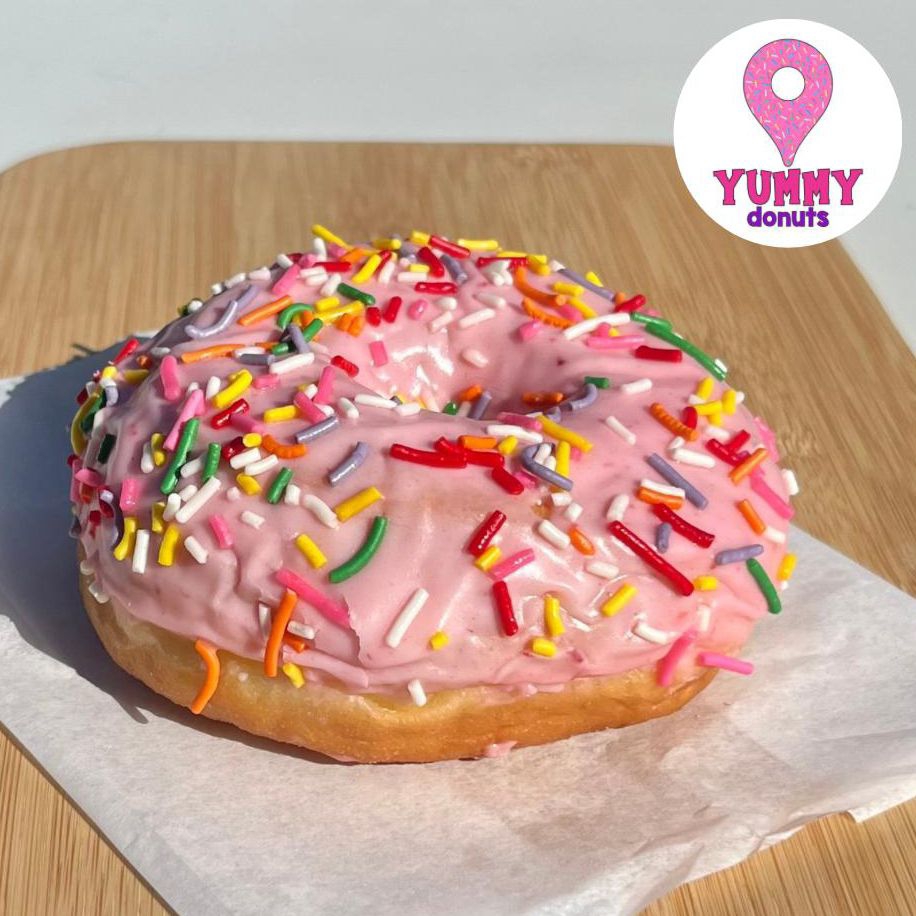 Dona glaseada de fresa con chispas de colores