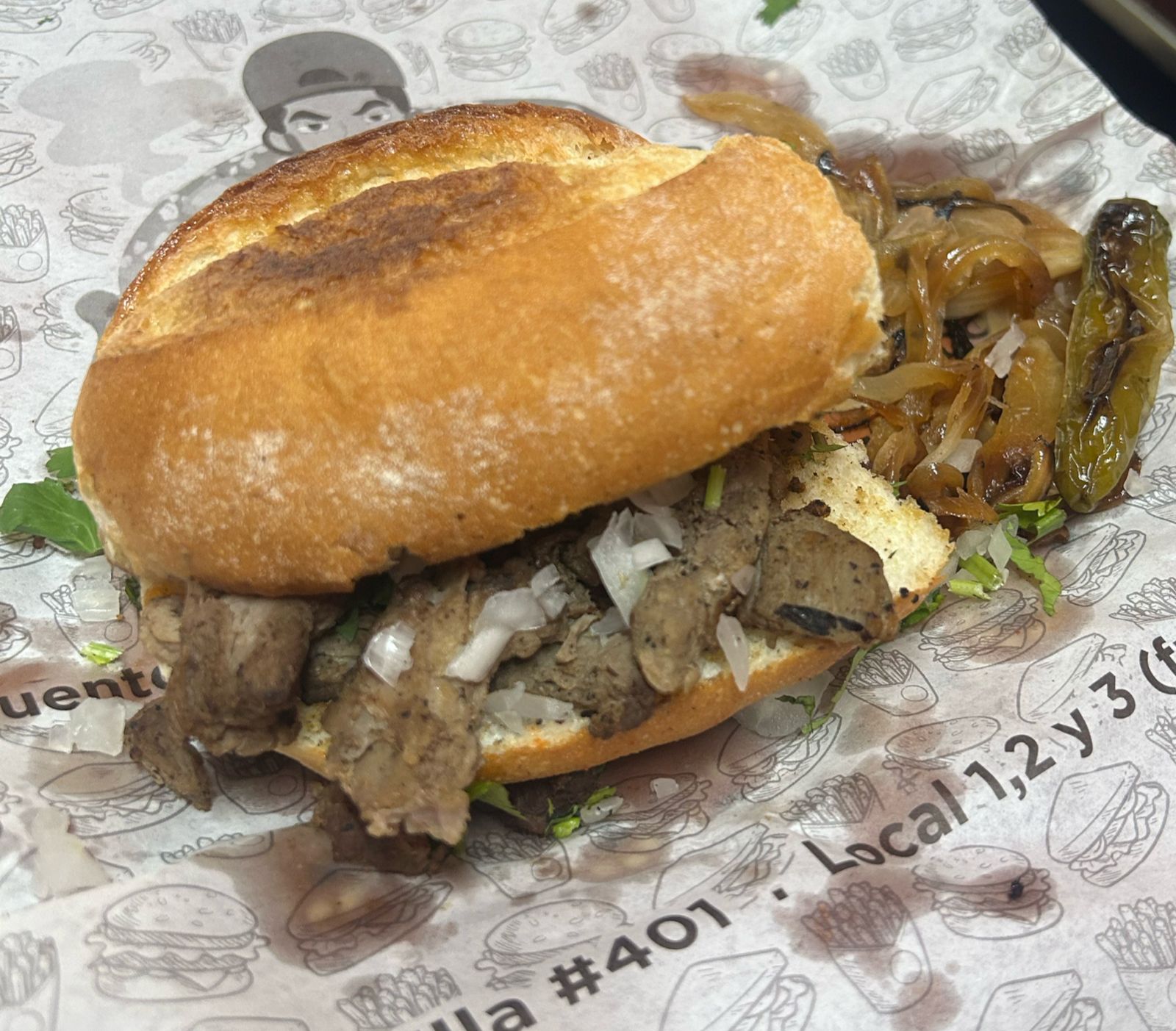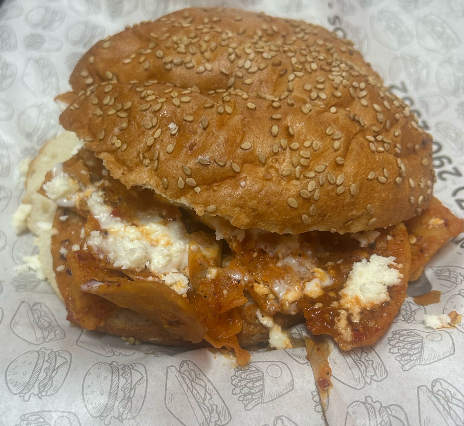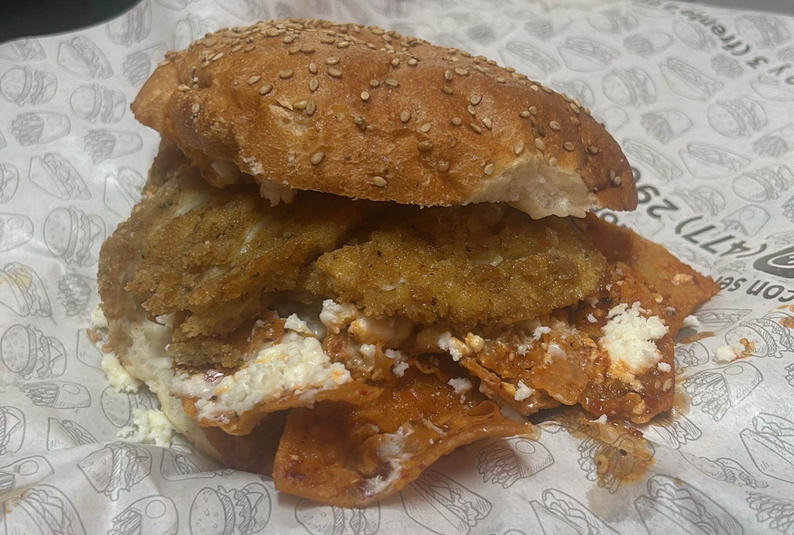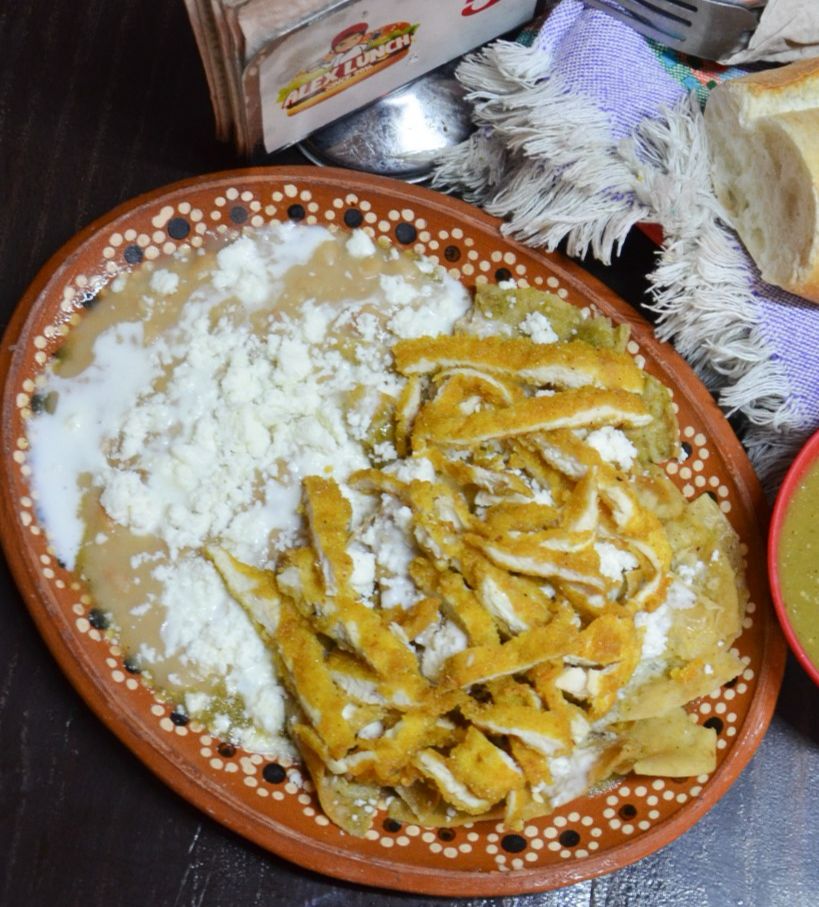 Acompañada de frijoles refritos, queso fresco y crema y un bolillono.