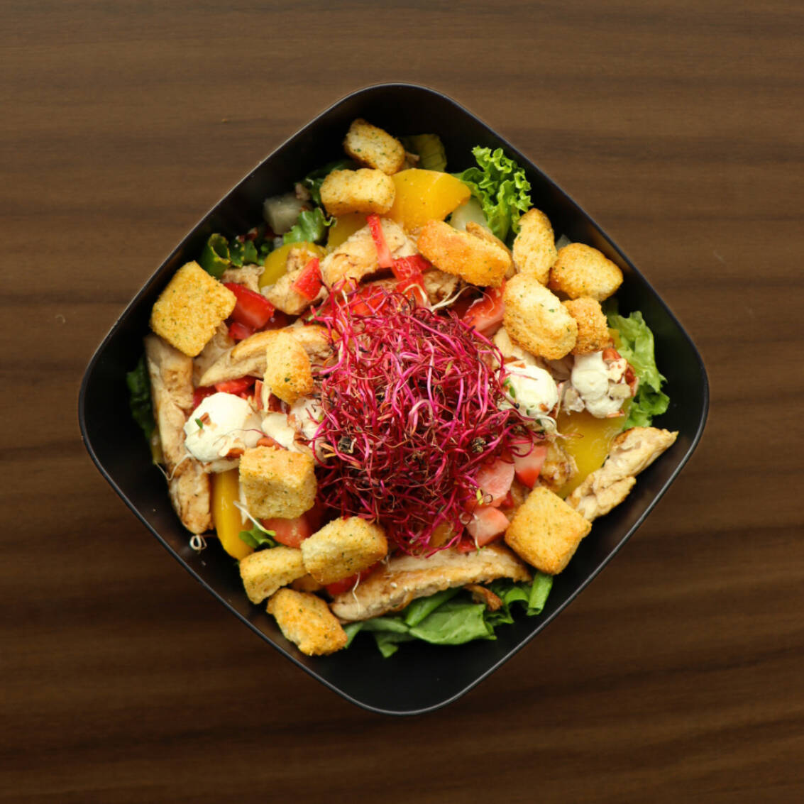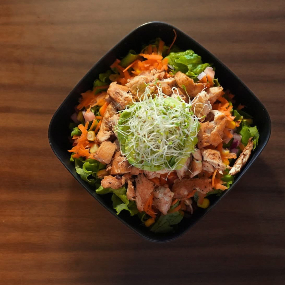 150 gramos de pechuga a la plancha, lechuga, zanahoria, jitomate, cebolla, granos de elote, aguacate y germen de alfalfa. Incluye aderezo RANCH