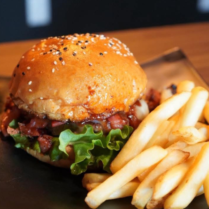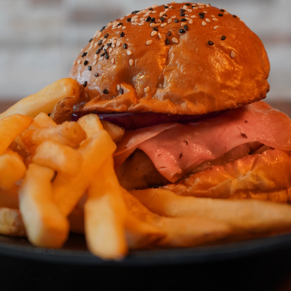 Hamburguesa de jugosos TENDERS de pollo bañados en la salsa de tu elección. Lleva queso amarillo, cebolla morada, lechuga, jitomate y aderezo de la casa.