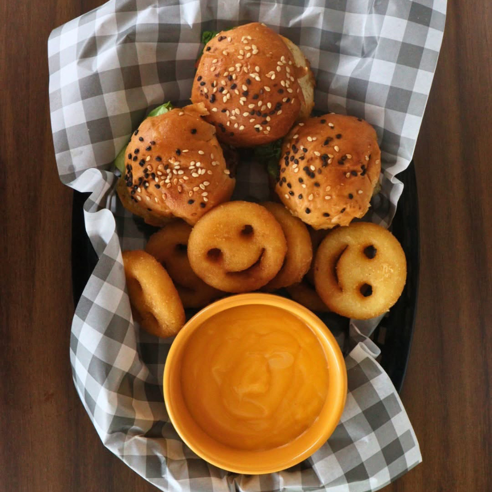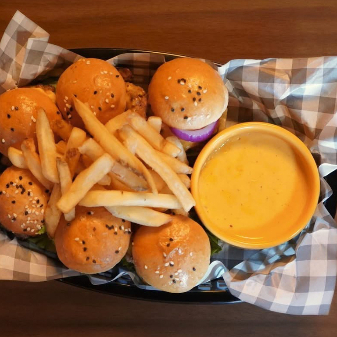 6 piezas de mini BURGERS, 30 gramos de carne cada una. Llevan queso amarillo, jitomate, cebolla morada, lechuga y aderezo de la casa. Acompañadas de salsa de queso.