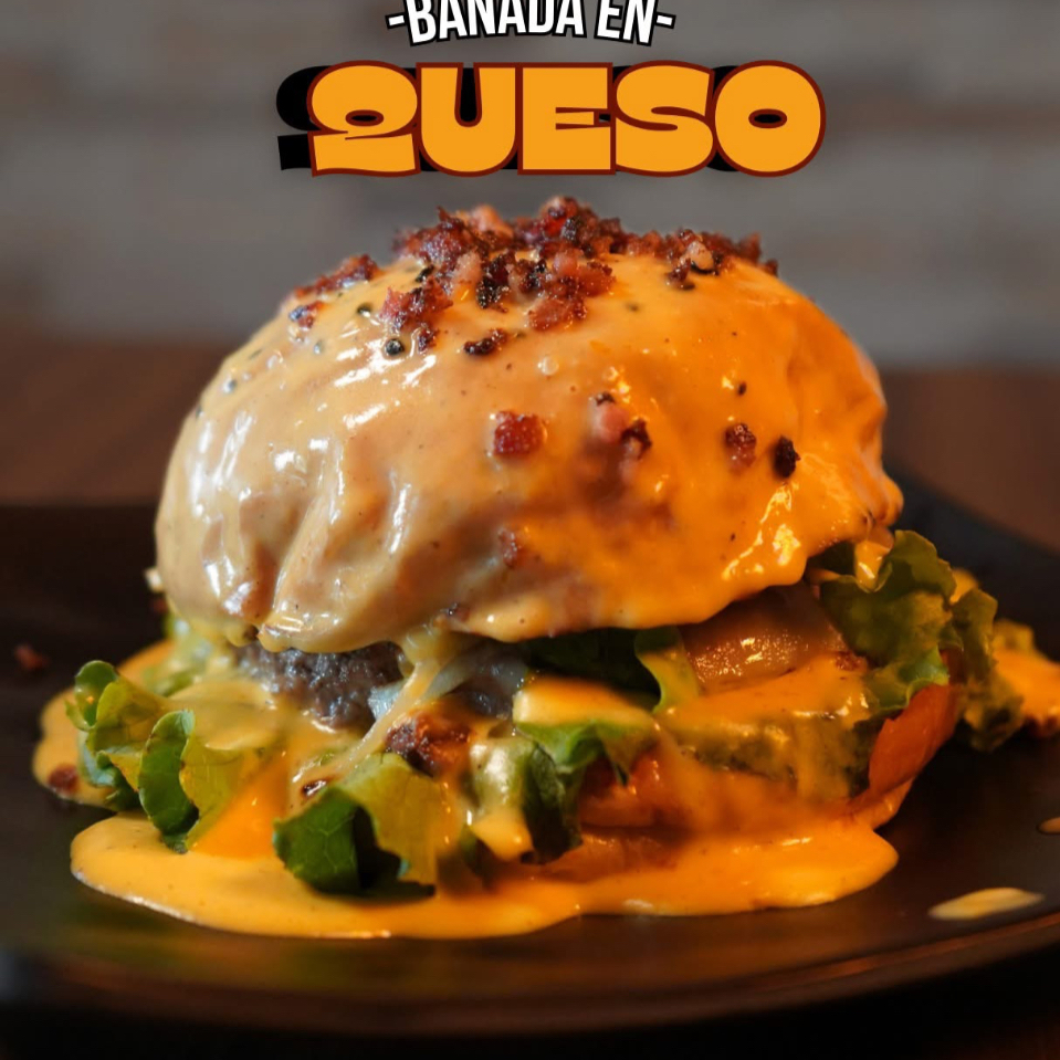 LA ESPECILIDAD DE LA CASA! 180 gramos de jugosa carne molida, cebolla caramelizada, queso CHEDDAR blanco, lechuga y aderezo de la casa. Va bañada en salsa de queso con bites de tocino.