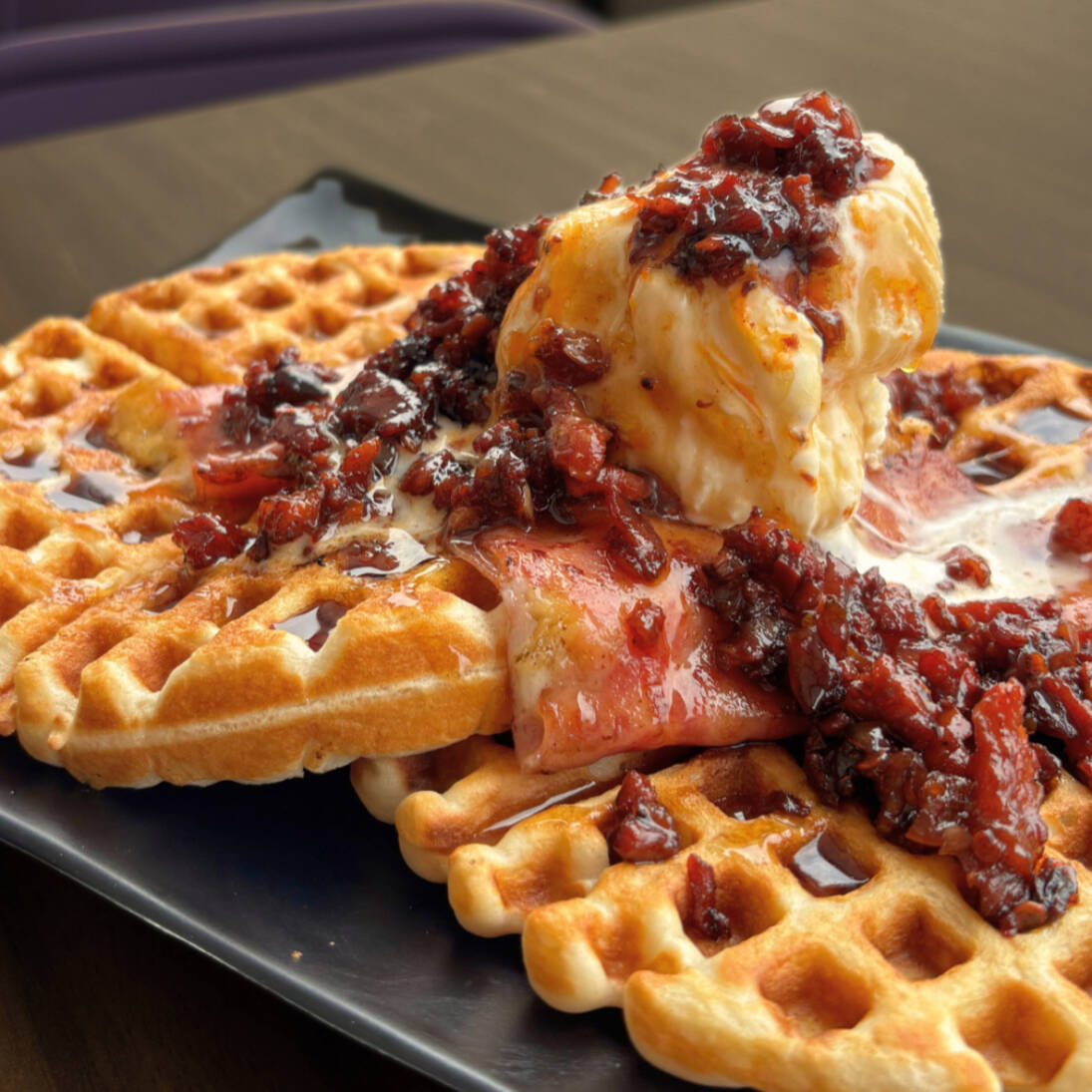 180 gramos de jugosa carne, acompañada de mermelada de tocino, cebolla caramelizada, lechuga, queso CHEDDAR blanco y aderezo de la casa.