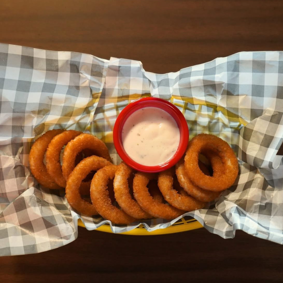Orden de 10 piezas crujientes de aros de cebolla, acompañados de aderezo RANCH.