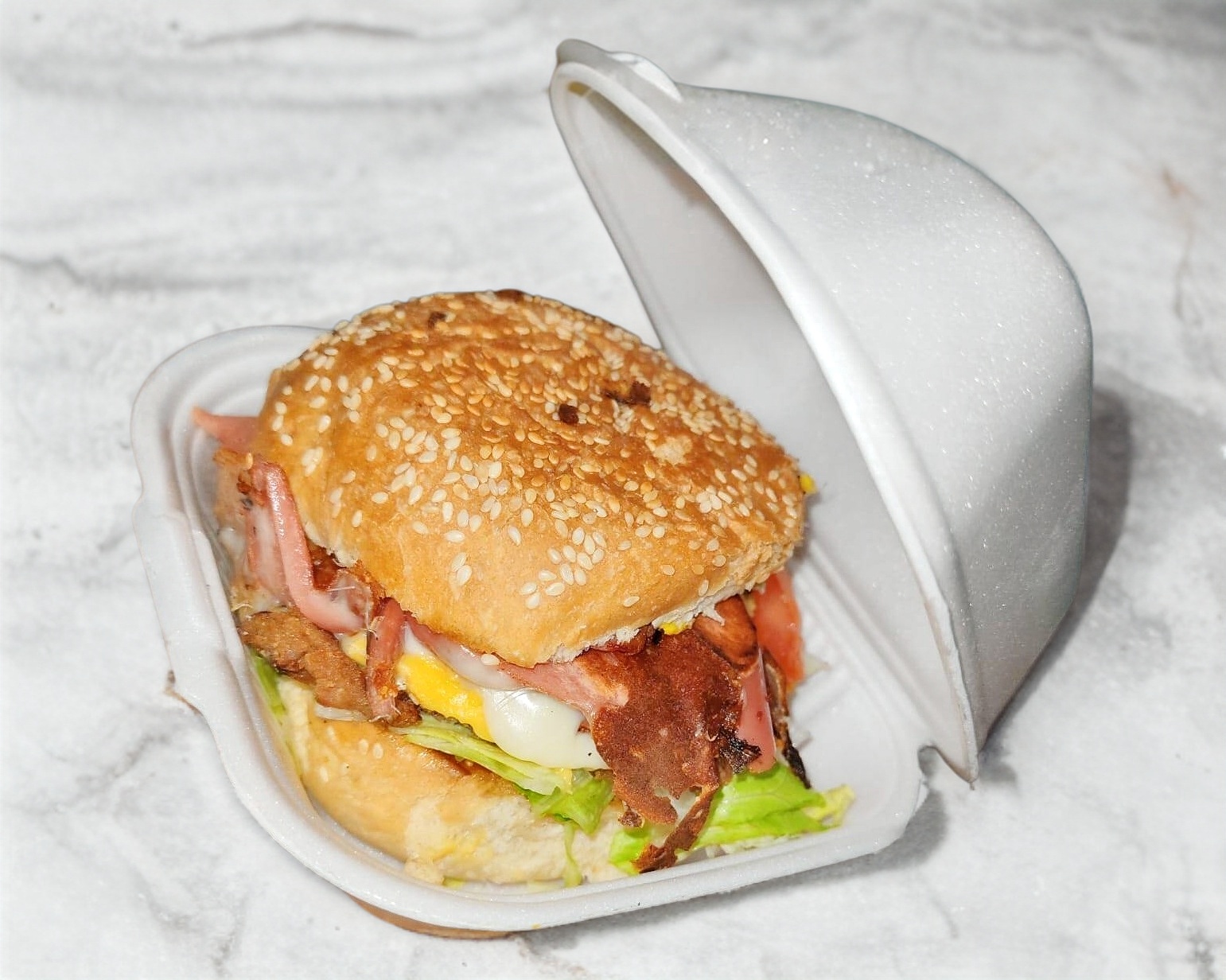 Hamburguesa con carne 100grs., tocino, piña, jamón, queso amarillo, lechuga, tomate, cebolla, chiles en vinagre