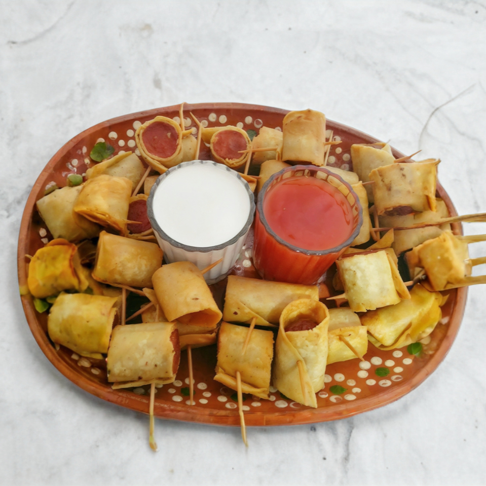 Salchichas envultas en tortilla doradas, acompañadas de aderezoz