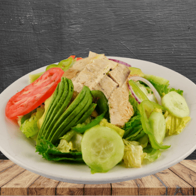 Tiras de pollo asado sobre un mix de lechuga italiana, orejona, romana, con aguacate, apio, pepino, jitomate, zanahoria, cebolla morada y crutones.