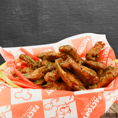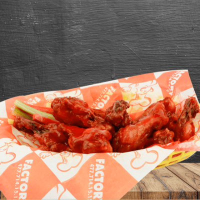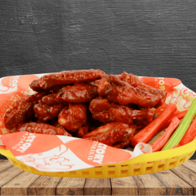 Las auténticas alitas bañadas en la salsa de tú elección con deliciosas guarniciones de zanahoria y apio.