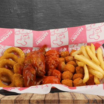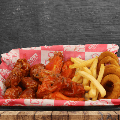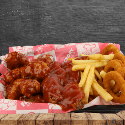 La combinación perfecta 4 alitas, 4 boneless bañados de tu salsa favorita, 4 nuggets, 12 palomitas de pollo, 200 gr de papas a la francesa y 4 aros.