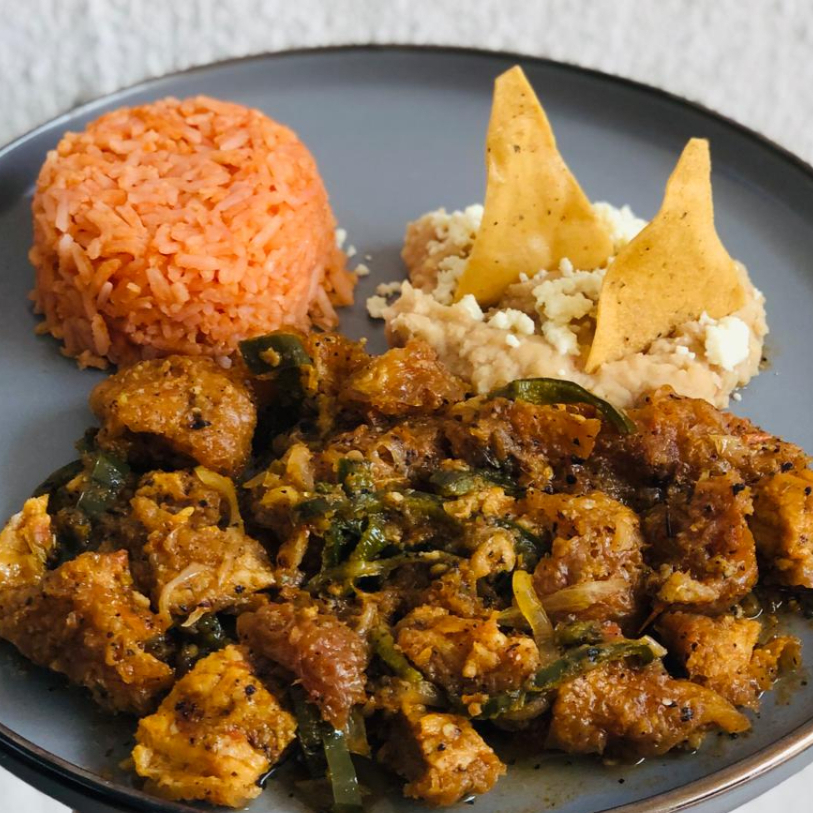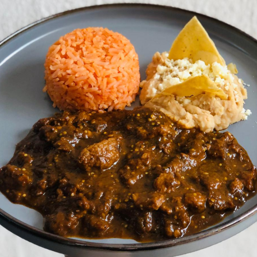 Con chorizo, chicharrón carnoso y bistec en salsa pasilla.