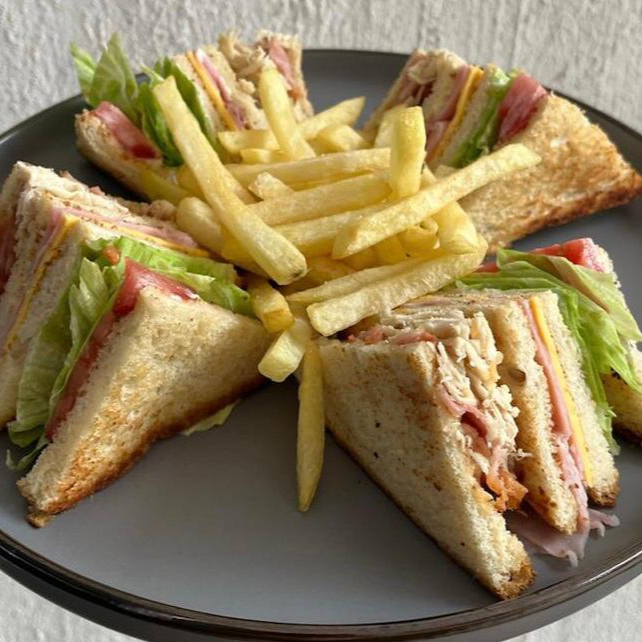 4 rebanadas de pan tostado, jamón, queso amarillo, tocino, pollo y verdura. Acompañado de papas a la francesa.