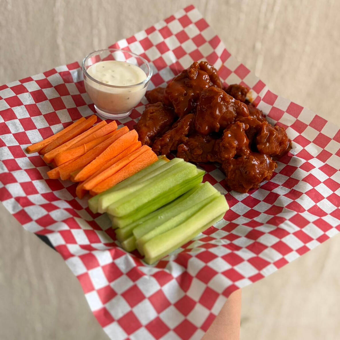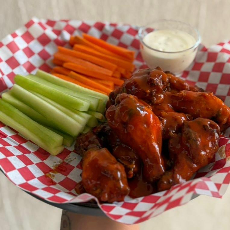 Jugosas alitas de pollo, bañadas en salsa de tu elección. Acompañadas de aderezo ranch y crudités.