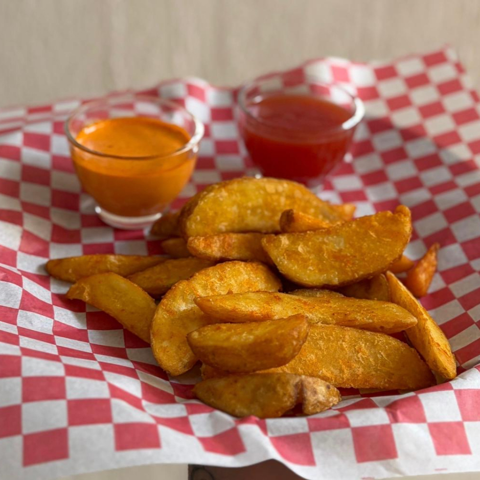 Papas gajo. Acompañadas de salsa chimichurri y cátsup.