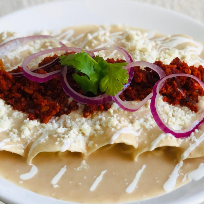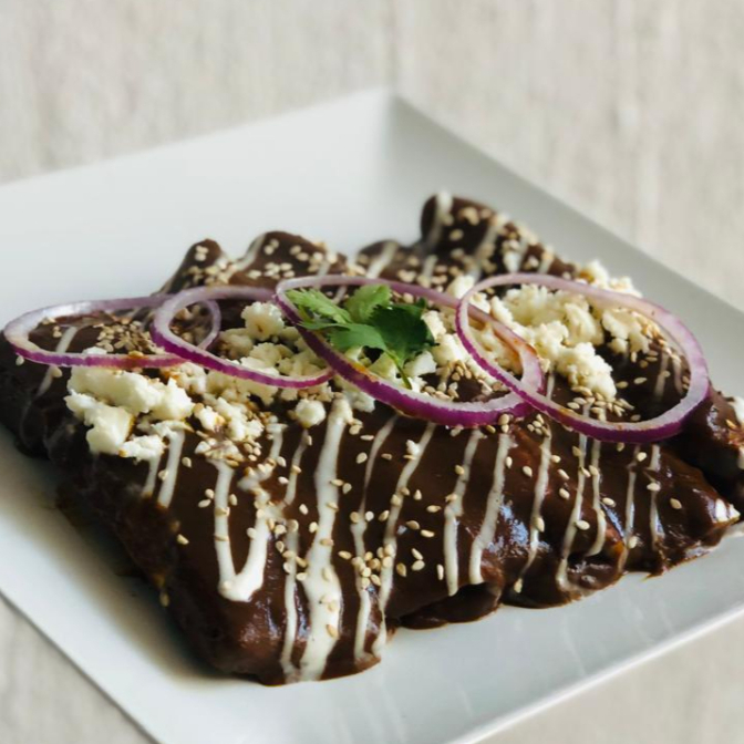 Rellenas de pollo, bañadas en mole, con crema y queso fresco. orden de 5 piezas