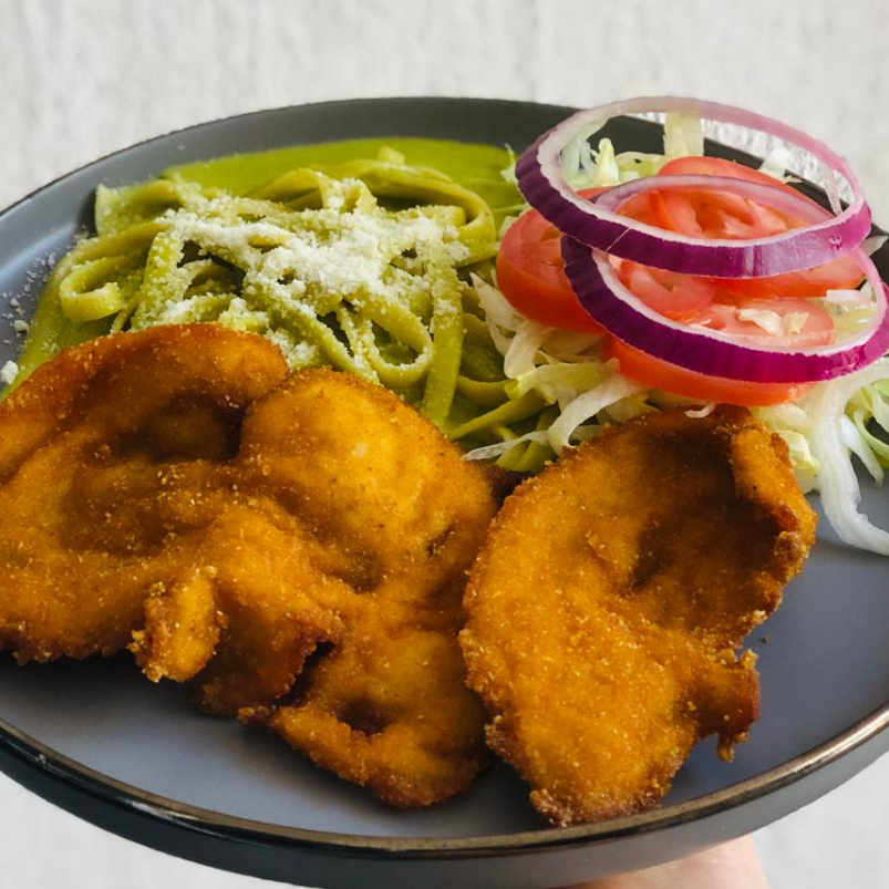 Acompañada de pasta poblana, ensalada, salsa y tortillas.