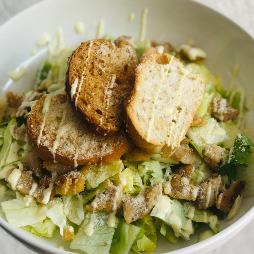 Preparada con lechuga romana, crutones, trocitos de pollo a la plancha, queso parmesano y aderezo césar.